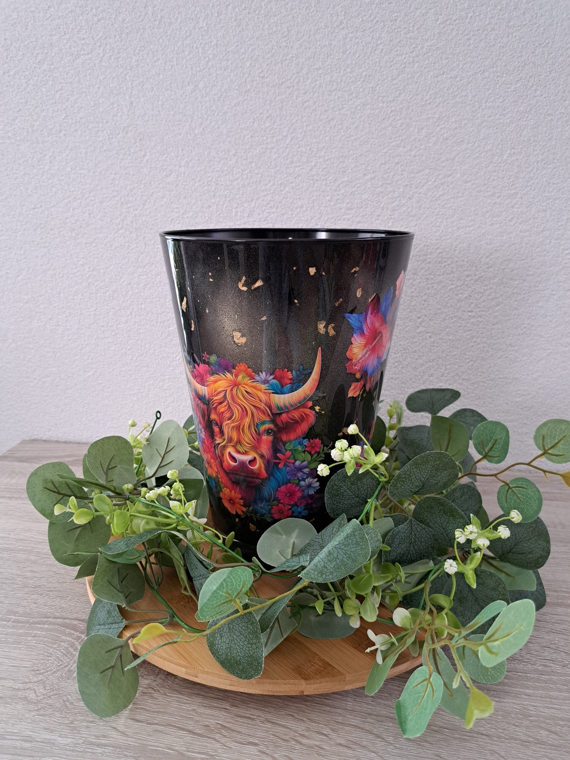 Vaas met kleurrijke bloemen en Schotse Hooglanders.